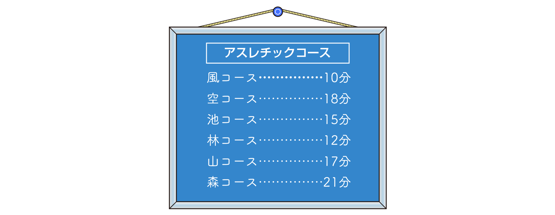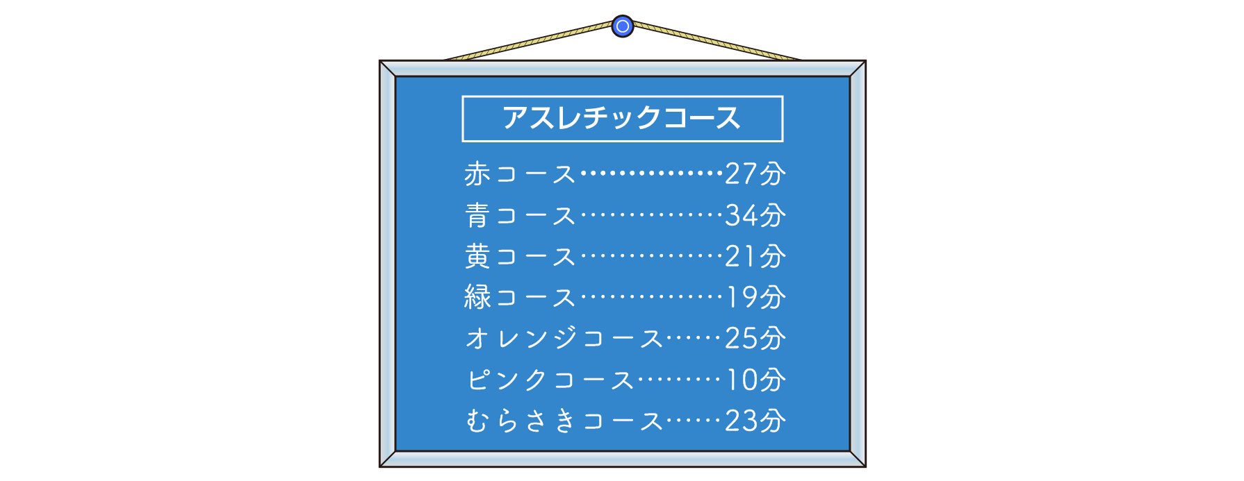 アスレチックコースが6つあり、それぞれのコースにかかる時間は下の通りです。かかる時間の合計が70分をこえないように、4つのちがうコースをえらびます。ただし、コースとコースの間の時間は考えないものとします。かかる時間の合計ができるだけ長くなるようにコースをえらぶと、合計何分になりますか。