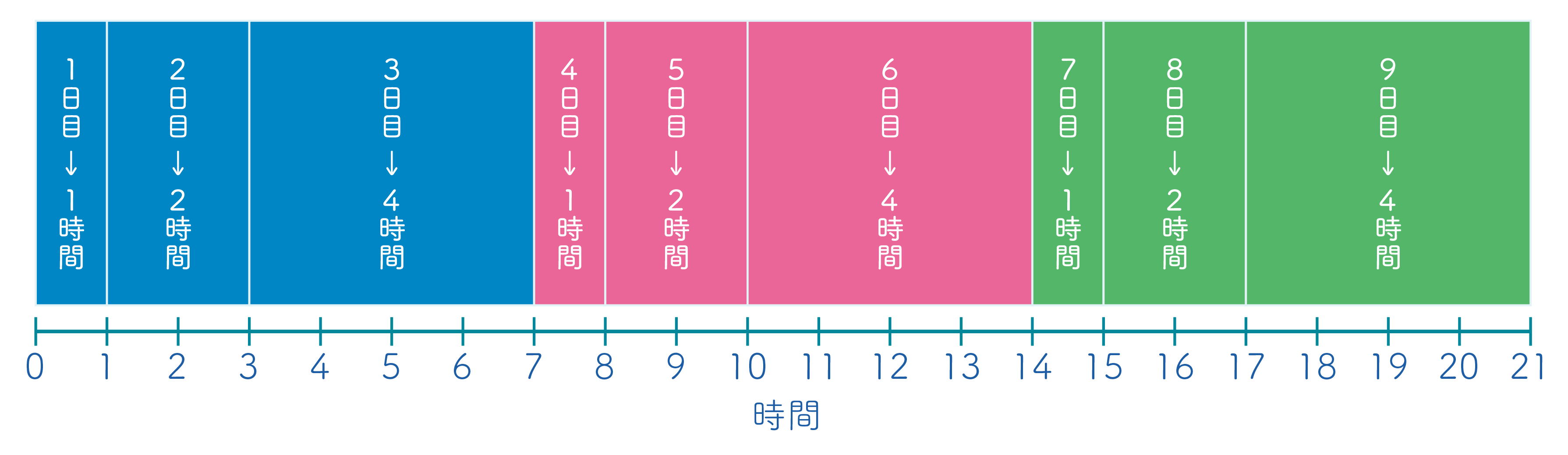 ⇒(1)を正解した7時間の子(4.3%)は、9日目までを合計すると 1+2+4+1+2+4+1+2+4=21時間となり20時間を超えるので、1日引いて8日目とした可能性があります。