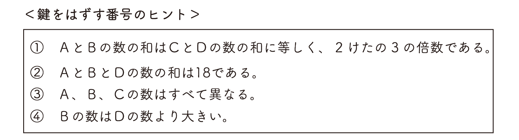 孝平さんは、この鍵をはずす番号を忘れてしまいました。しかし、念のため鍵をはずす番号のヒントをメモしておいたので、それをもとに考えることにしました。