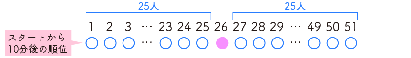 (1) はるとさんは、10分後にちょうど真ん中を走っていました。51人の真ん中は26番目なので、26位です。