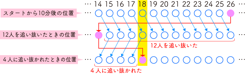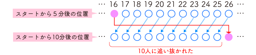 (2) スタートから5分後には16番目を走っていたので、26−16=10 より、10人に追い抜かれました。